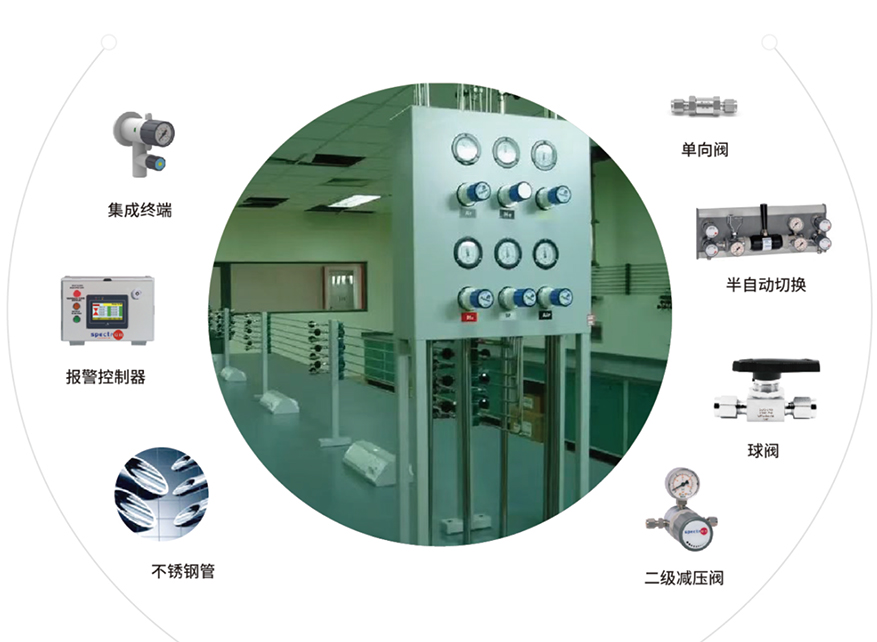 采用集中供氣形式,氣瓶室房間內(nèi)安裝泄露報(bào)警裝置并且連動(dòng)緊急排風(fēng),避免危險(xiǎn)發(fā)生